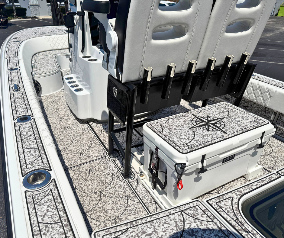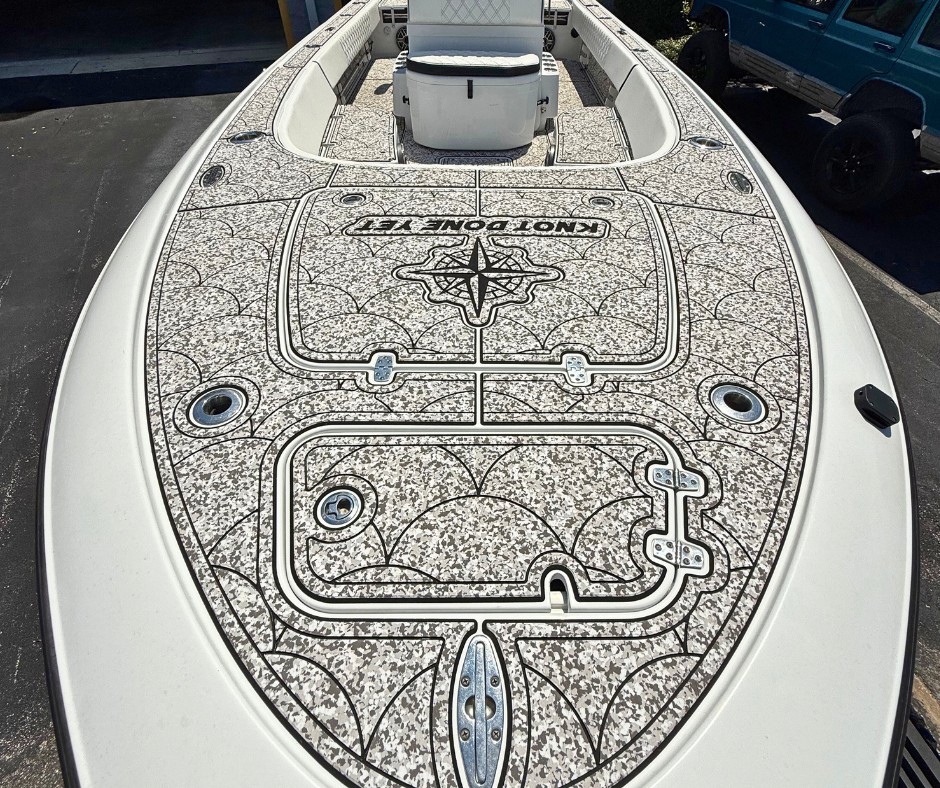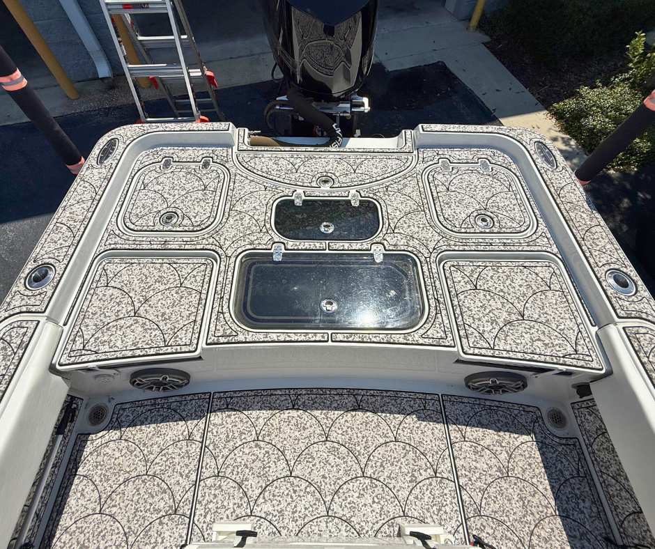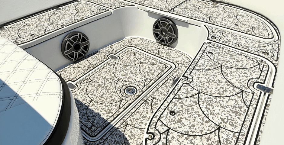 The solution? Custom SeaDek® flooring in an eye-catching fish scale pattern, featuring the snow camo colorway over a sleek black base.
