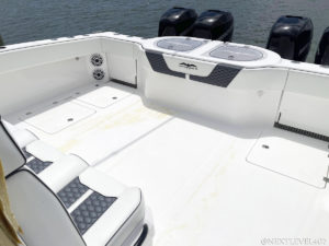 BEFORE-Blue-Invincible-Boat-Custom-SeaDek-Marine-Flooring-Pad-Upgraded-Speakers-Full-Rear-Mercury-Engines-Custom-Logo-Pad-On-Water-Leather-Upholstery-Seats-Grey-Center-Console